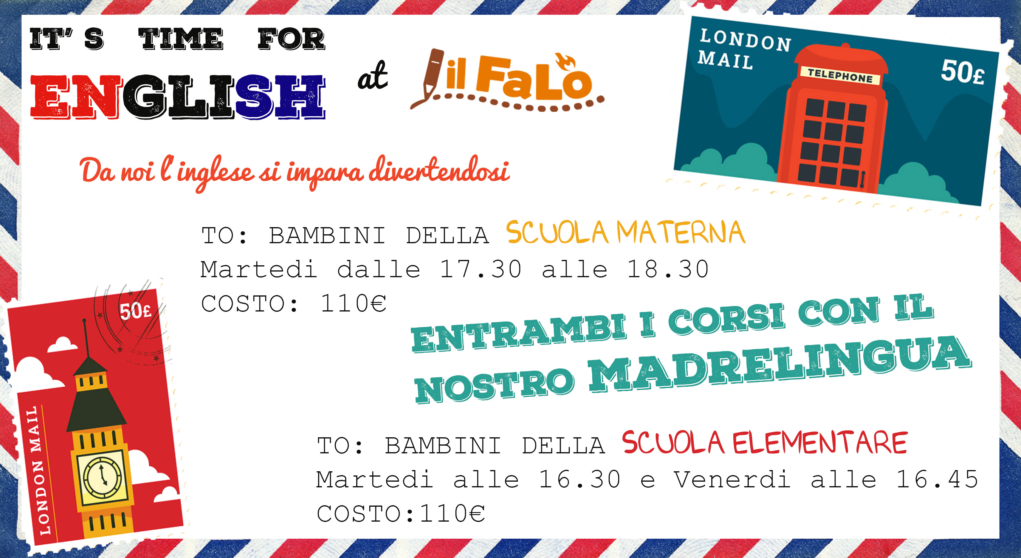 Laboratorio di lingua inglese con MADRELINGUA. I nostri insegnanti madrelingua condurranno i bambini/ragazzi in un mondo magico dove si parlerà solo in inglese. L'approccio alla lingua straniera avverrà in un'atmosfera giocosa e stimolante, in un contesto particolarmente gratificante.